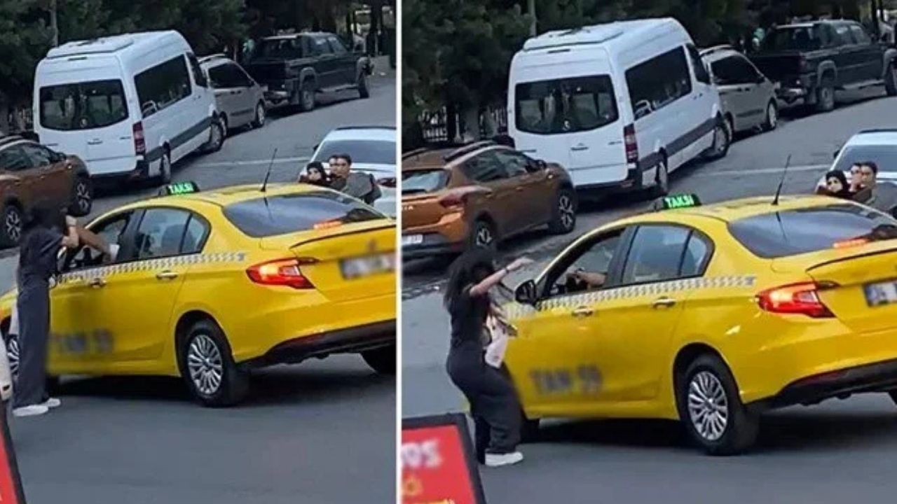 Duruma sinirlenen genç kız, taksinin önünü kesip fotoğrafını çektikten sonra ikili tartışmaya başladı.