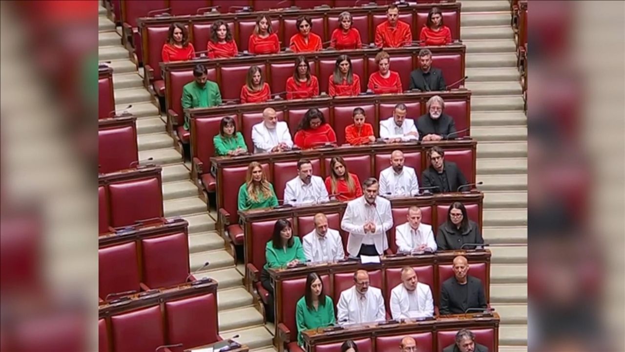 Parlamentonun alt kanadı Temsilciler Meclisi’ndeki oturumda kırmızı, siyah, yeşil ve beyaz renk kıyafetlerle Filistin bayrağı şeklinde oturan M5S milletvekilleri, Filistin bayrağının insanlık için mücadele edenlerin evrensel bayrağı haline geldiği mesajını verdi.