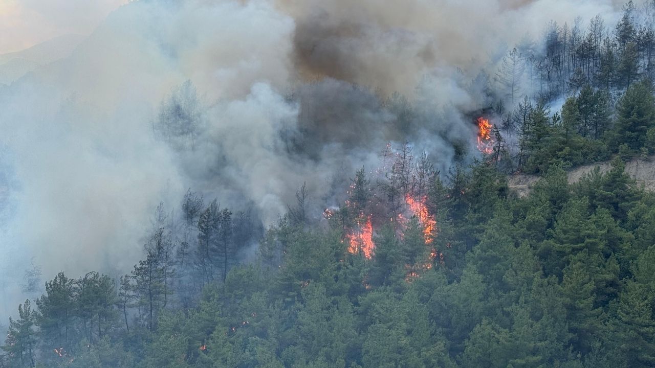 Yüksek ve eğimli bölgede etkili olan alevleri söndürmek için ekiplerin havadan ve karadan müdahalesi sürüyor.