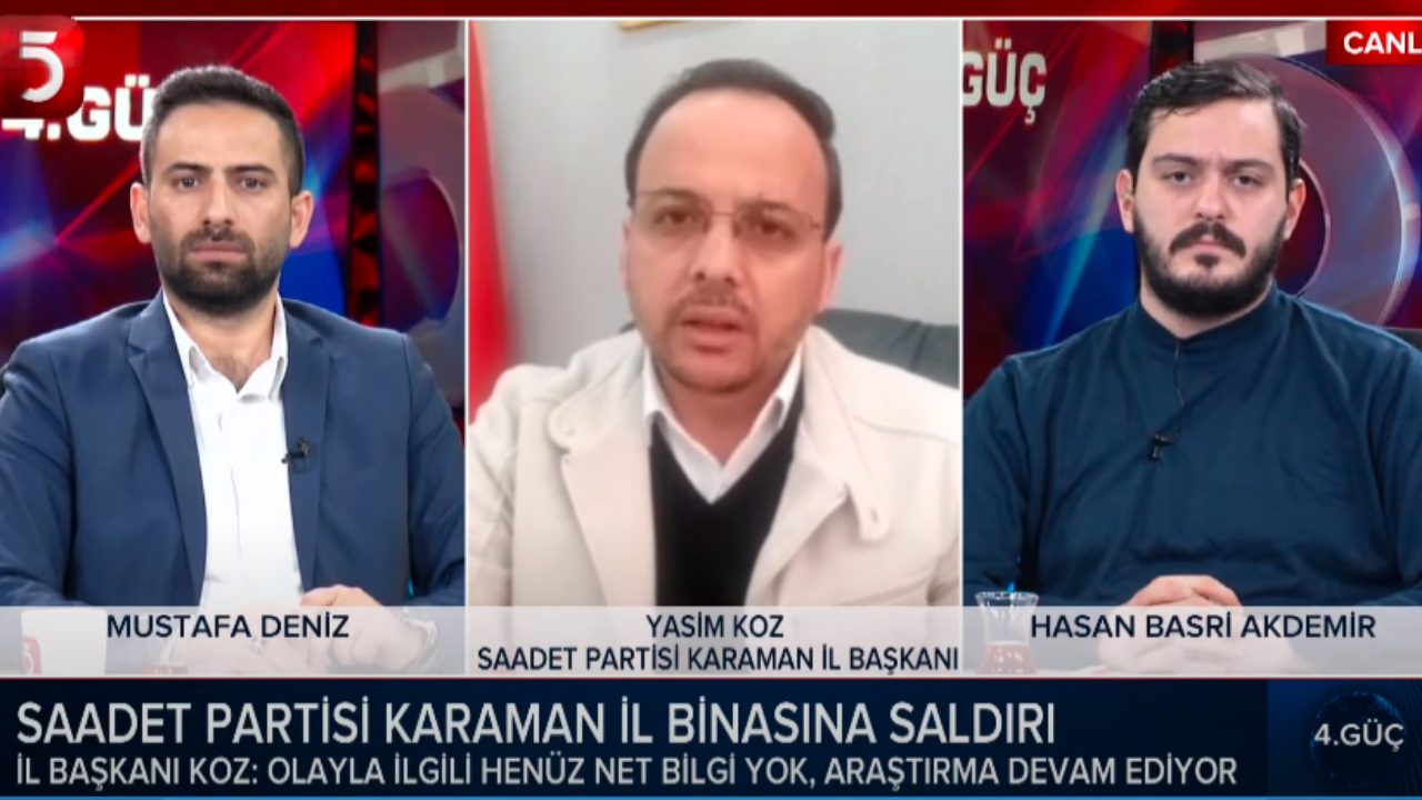 Saadet Partisi Karaman İl Başkanı Yasim Koz, TV5’te yayınlanan 4. Güç programında saldırıya ilişkin açıklamalarda bulundu. Zor, saldırının emniyet tarafından araştırıldığını belirterek, “Millet İttifakı adayının açıklanmasından sonra böyle bir saldırının gerçekleşmesi kafalarda soru işareti bırakıyor” dedi.