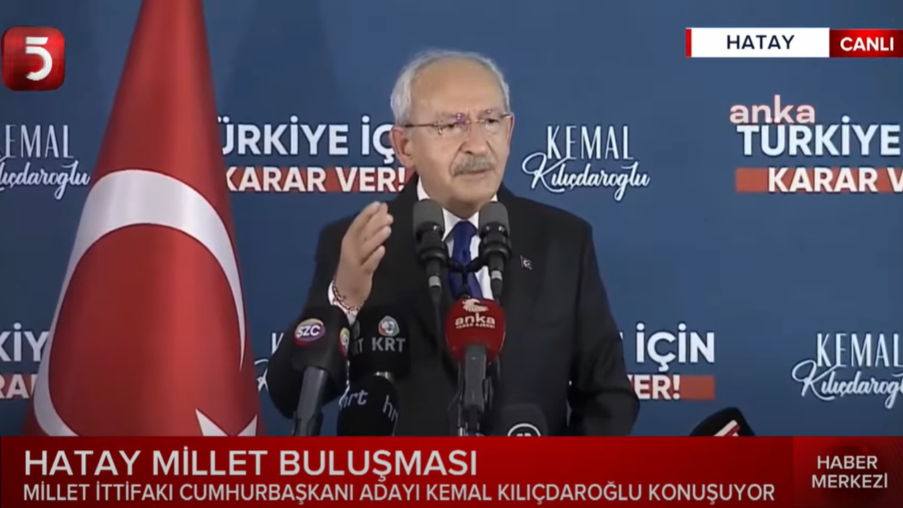 Cumhurbaşkanlığı seçiminin ikinci turuna beş gün kalmışken, 13. Cumhurbaşkanı adayı ve CHP Genel Başkanı Kemal Kılıçdaroğlu, sahadaki çalışmalarına devam ediyor. Bugün deprem bölgesi Hatay'da konuşan Kılıçdaroğlu, sığınmacıları en geç iki yılda göndereceklerini ve terörle kararlı bir şekilde mücadele edeceklerinin yeniden altını çizdi. Cumhurbaşkanı Recep Tayyip Erdoğan'ın, muhalefeti karalamak için hazırlanan videonun montaj olduğunu açıkça ifade etmesine de değinen Kılıçdaroğlu, siyasette ahlaklı mücadelenin önemine vurgu yaptı.