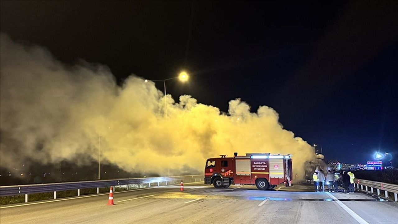 Otoyolun Akyazı gişeleri mevkisinde ambar malzemesi taşıyan H.E. idaresindeki 64 FL 009 plakalı tırın dorsesi, henüz belirlenemeyen nedenle alev aldı.