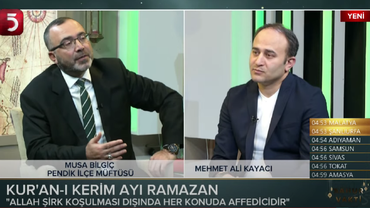 TV5 televizyonunda Mehmet Ali Kayacı’nın sunduğu Sahur Vakti Programına Pendik İlçe Müftüsü Musa Bilgiç konuk oldu. Rahmet ve bereket ayı olan Ramazan’a ilişkin konuşan Bilgiç, Kur’an-ı Kerim’in öneminden ve Müslümanca yaşamaya ilişkin açıklamalarda bulundu.