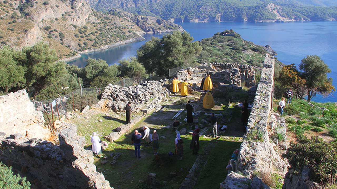 Kayaköy Mahallesi’ndeki Gemile koyuna gelen Moskova Patrikhanesi’ne bağlı olarak Türkiye’de faaliyet gösteren Rus Ortodoks Kilisesi temsilcileri ile Rus vatandaşları, tekne ile Saint Nicholas Adası’na geçti.