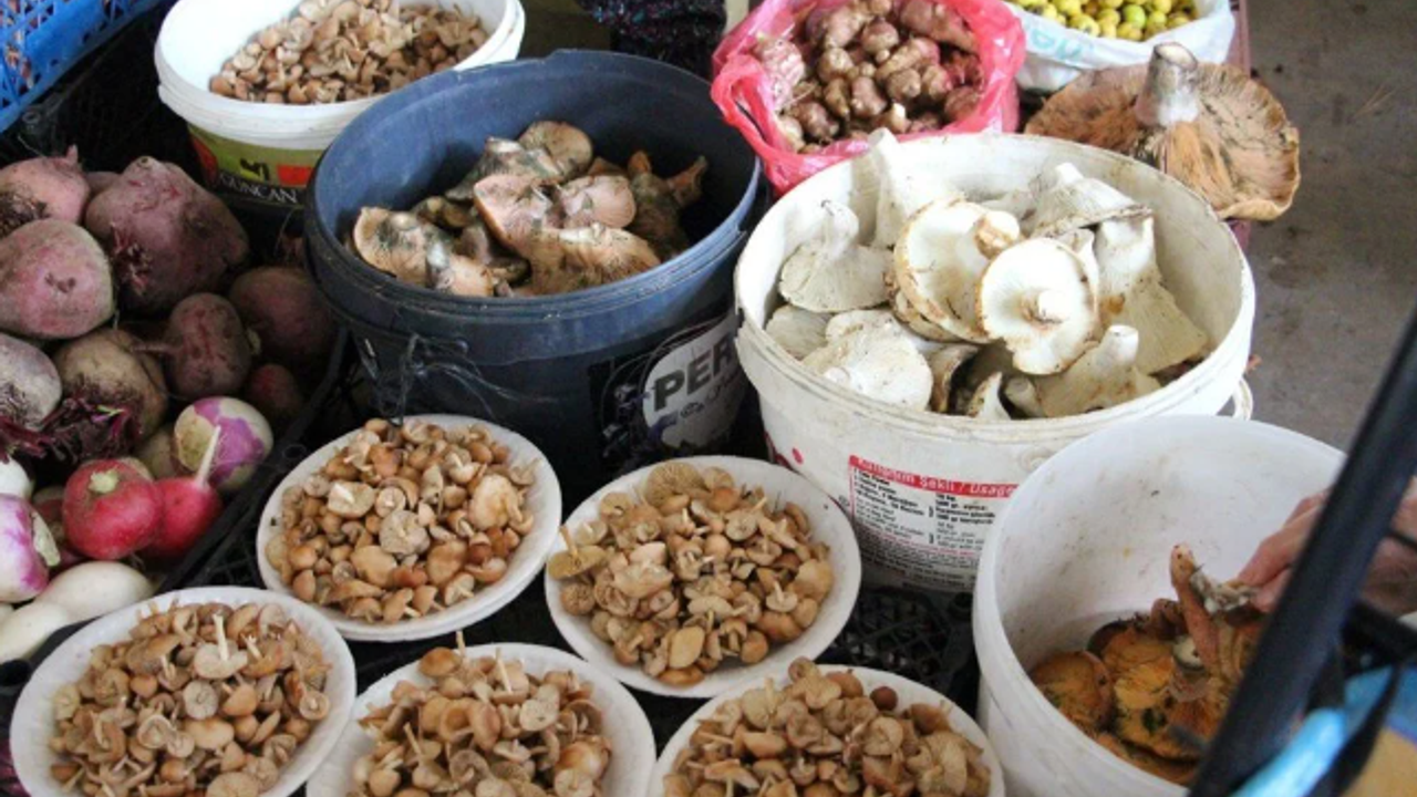 Ormanlık alanlara giden vatandaşlar, kova kova mantar toplayarak İhsaniye Mahallesi'nde kurulan halk pazarında satışa sundu.