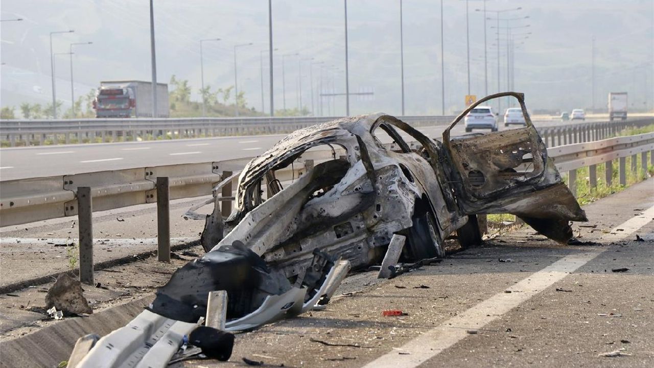 İtfaiye erleri araçtaki yangını söndürürken, hayatını kaybettiği belirlenen sürücü Cengiz N. ile araçtaki Kerem A’nın cenazeleri morga götürüldü. (AA)