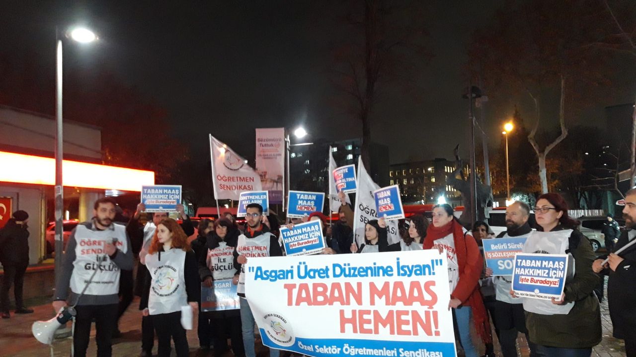 Özel sektör öğretmenlerinin yaptığı basın açıklaması ise şu şekilde: “Yeni asgari ücretin açıklanmasıyla birlikte taban maaş talebimiz ve onun hayata geçme zorunluluğu bir kez daha tescillendi. Eğitim Nöbeti sonrasında devam eden görüşmelerde alınan mesafe, artık yasa düzeyinde somut bir düzenlemenin zamanının geldiğini gösteriyor çünkü belirli süreli iş sözleşmesinin varlığıyla birlikte düşünüldüğünde, asgari ücret düzeninin özel öğretim kurumlarındaki karşılığı, 2026 Ocak ayına kadar alınacak yaygın öğretmen maaşını işaret ediyor. Bu ücret 22.104 TL'dir”