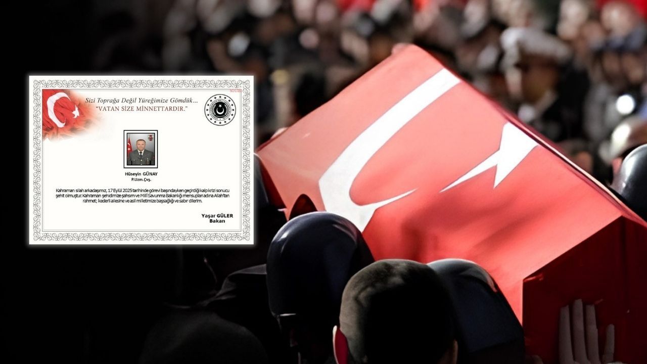 Milli Savunma Bakanlığı, sosyal medya hesabından Bakan Yaşar Güler’in mesajını yayımladı. Güler, ''Kahraman silah arkadaşımız, 17 Eylül 2025 tarihinde görevi başındayken geçirdiği kalp krizi sonucu şehit olmuştur. Kahraman şehidimize şahsım ve Milli Savunma Bakanlığı mensuplarından Allah’tan rahmet; kederli ailesine ve asil milletimize başsağlığı ve sabır dilerim'' ifadelerine yer verdi