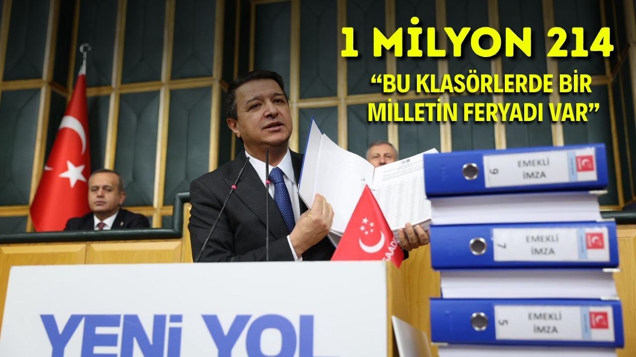 Saadet Partisi’nin emekliler için başlattığı imza kampanyasına milletin büyük destek verdiğini dile getiren Arıkan, TBMM kürsüsünde 1 milyon 214 binden fazla imzanın bulunduğu klasörleri göstererek şu ifadeleri kullandı: