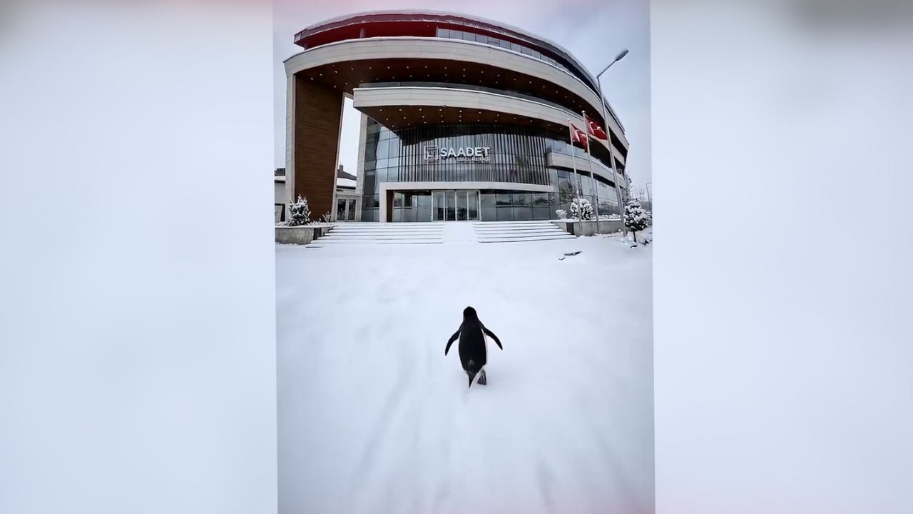 Saadet Partisi tarafından paylaşılan videoda yalnız penguen Saadet Partisi Genel Merkezi'ne yürüdü.