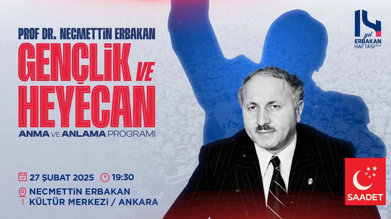 Saadet Partisi, 27 Şubat 2025'te saat 19:30'da Ankara Necmettin Erbakan Kültür Merkezi'nde Prof. Dr. Necmettin Erbakan'ın vefatının 14'üncü yılına ilişkin "Erbakan; Gençlik ve Heyecan" başlıklı program düzenleyecek.
