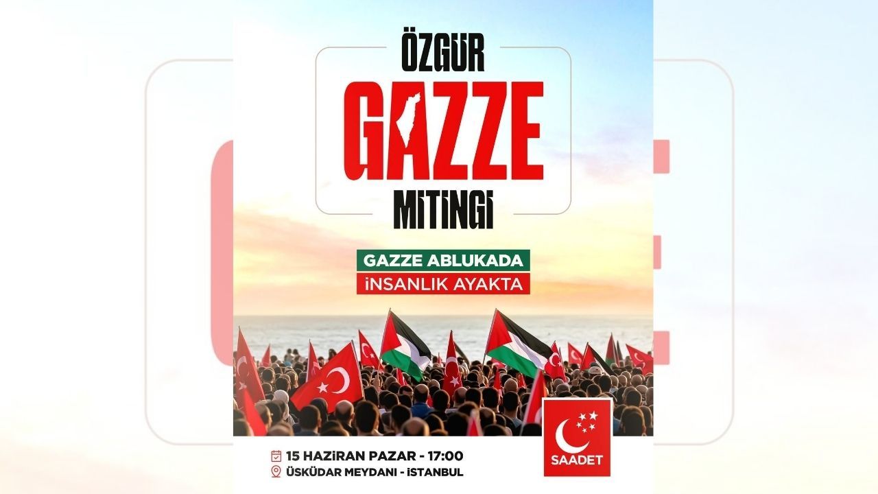 Saadet Partisi, İsrail’in Gazze’de gerçekleştirdiği sivil katliamına tepki göstermek ve uluslararası kamuoyunun vicdanını harekete geçirmek amacıyla 15 Haziran 2025 Pazar günü, saat 17.00’de İstanbul Üsküdar Meydanı’nda geniş katılımlı bir miting düzenleyeceğini duyurdu.