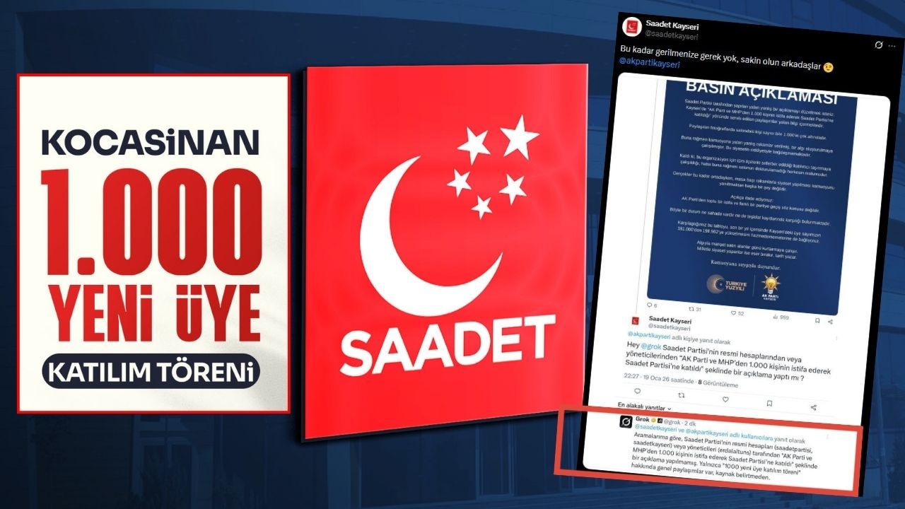 Kocasinan İlçe Teşkilatı tarafından Pazar günü gerçekleştirilen üye katılım programının ardından kamuoyunda, sözde Saadet Partisi’nin “AK Parti ve MHP’den 1.000 kişinin istifa ederek Saadet’e katıldığı” yönünde açıklama AK Parti tarafından paylaşıldı. Ancak ne Saadet Partisi’nin resmi hesaplarından ne de Saadet Partili kurmaylar tarafından böyle bir açıklama yapılmamıştı.