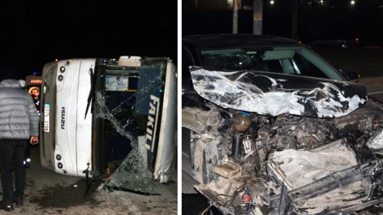 Çarpışmanın etkisiyle devrilen servis minibüsü ve otomobilde bulunan 10 kişi yaralandı. Yaralılar, kazayı görenlerin ihbarıyla gelen sağlık ekiplerinin ilk müdahalesinin ardından ambulanslarla kentteki hastanelere kaldırıldı.