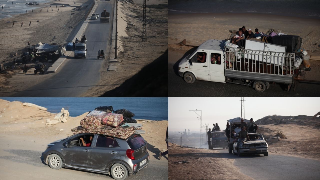 Katil İsrail ordusunun Gazze Şeridi’nin kuzeyine yönelik yoğun saldırıları nedeniyle Filistinlilerin orta ve güney bölgelere göçü sürüyor. Bölge halkı, yanlarına alabildikleri eşyalarla araçlarıyla er-Reşid Caddesi üzerinden Gazze’nin orta kesimine doğru ilerledi.