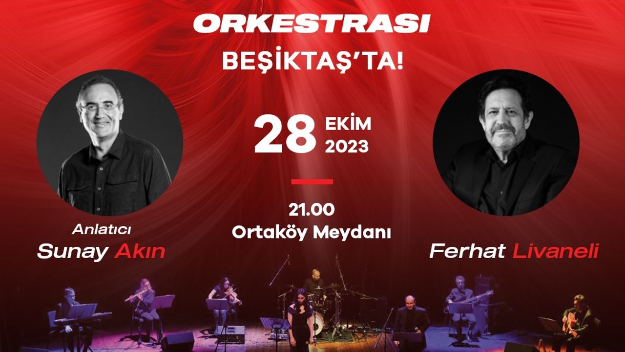 Beşiktaş Belediyesi, Türkiye Cumhuriyeti’nin kuruluşunun 100. yılı kapsamında 28 Ekim Cumartesi günü Anlatıcı Sunay Akın eşliğinde Ferhat Livaneli Orkestrası’nın İstanbullularla buluşacağı bir konser düzenliyor. Ortaköy Meydanı’nda gerçekleşecek olan konserde cumhuriyet coşkusu doyasıya yaşanacak.