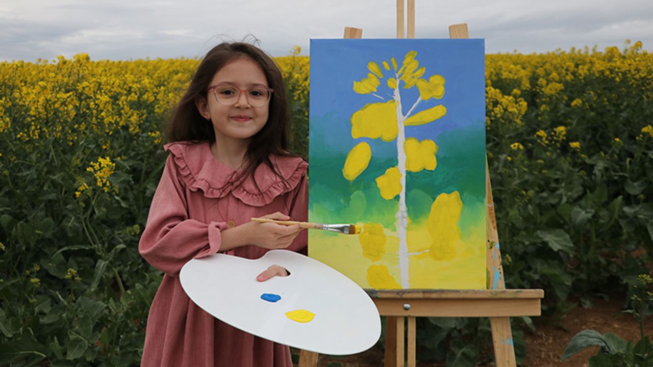 Minik ressam, Tekirdağ'da çiçek açan kanola bitkisiyle sarıya bürünen tarlalarda, yeni eserlerini sanatseverlerle buluşturmak için tuvalinin başına geçti.