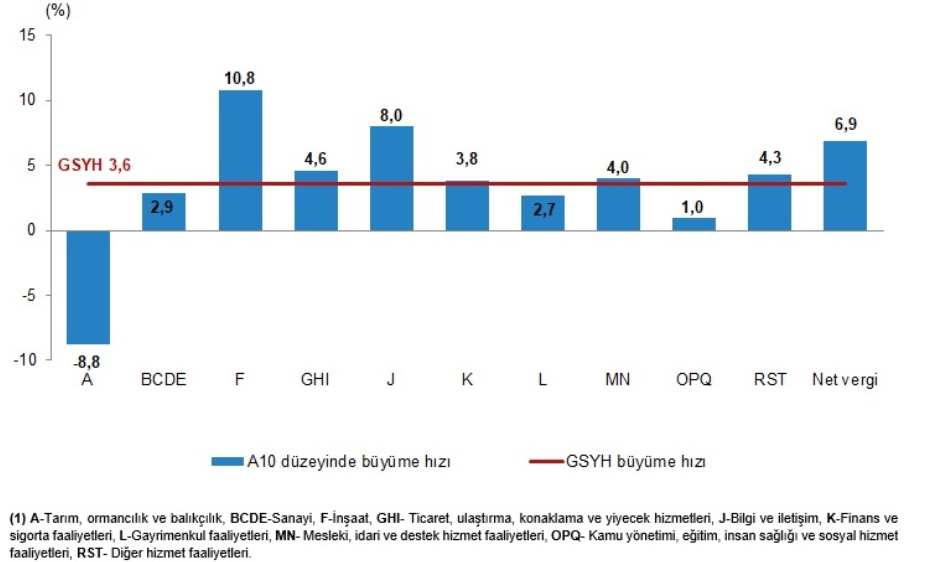 GSYH'yi oluşturan faaliyetler incelendiğinde; 2025 yılında bir önceki yıla göre zincirlenmiş hacim endeksi olarak; inşaat sektörü toplam katma değeri %10,8, bilgi ve iletişim faaliyetleri %8,0, ürün üzerindeki vergiler eksi sübvansiyonlar %6,9, ticaret, ulaştırma, konaklama ve yiyecek hizmetleri %4,6, diğer hizmet faaliyetleri %4,3, mesleki, idari ve destek hizmet faaliyetleri %4,0, finans ve sigorta faaliyetleri %3,8, sanayi %2,9, gayrimenkul faaliyetleri %2,7, kamu yönetimi, eğitim, insan sağlığı ve sosyal hizmet faaliyetleri %1,0 arttı. Tarım sektörü ise %8,8 azaldı.