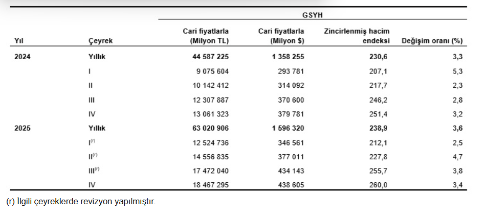 GSYH 2025 yılının dördüncü çeyrek ilk tahmini; zincirlenmiş hacim endeksi olarak, bir önceki yılın aynı çeyreğine göre %3,4 arttı.
