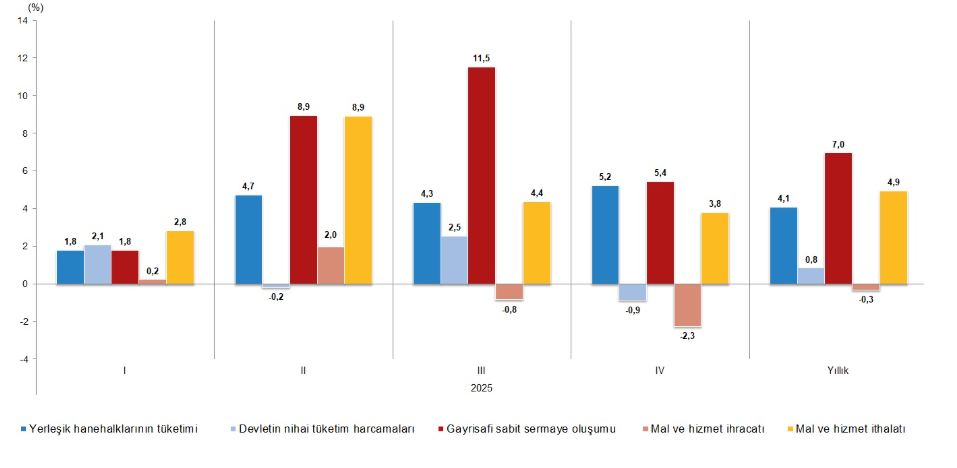 Yerleşik hanehalklarının nihai tüketim harcamaları 2025 yılının dördüncü çeyreğinde bir önceki yılın aynı çeyreğine göre zincirlenmiş hacim endeksi olarak %5,2 arttı. Devletin nihai tüketim harcamaları %0,9 azalırken gayrisafi sabit sermaye oluşumu %5,4 arttı.