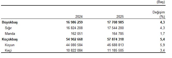 Küçükbaş hayvan kategorisinde, koyun sayısı bir önceki yıla göre %5,9 oranında artarak 46 milyon 689 bin baş, keçi sayısı ise bir önceki yıla göre %3,4 oranında artarak 11 milyon 186 bin baş oldu.