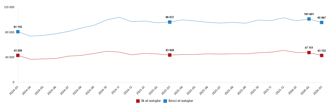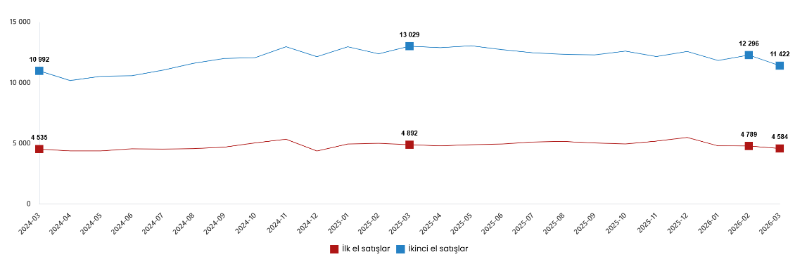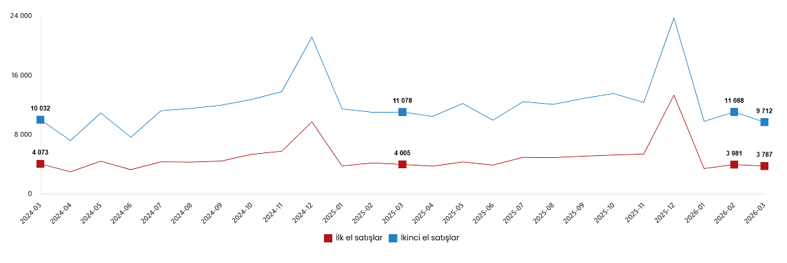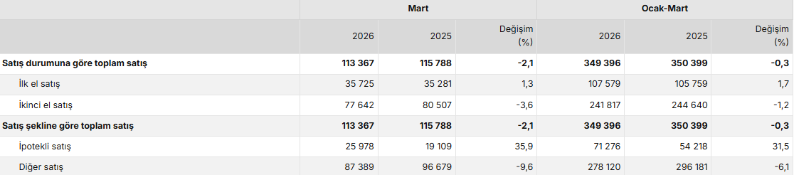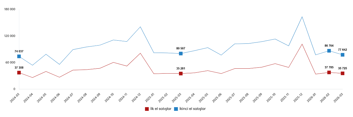 Türkiye genelinde ilk el konut satış sayısı Mart ayında bir önceki yılın aynı ayına göre %1,3 oranında artarak 35 bin 725 oldu. İkinci el konut satışları ise Mart ayında bir önceki yılın aynı ayına göre %3,6 oranında azalarak 77 bin 642 oldu. Toplam konut satışları içinde ilk el konut satışlarının payı %31,5, ikinci el konut satışlarının payı %68,5 oldu.