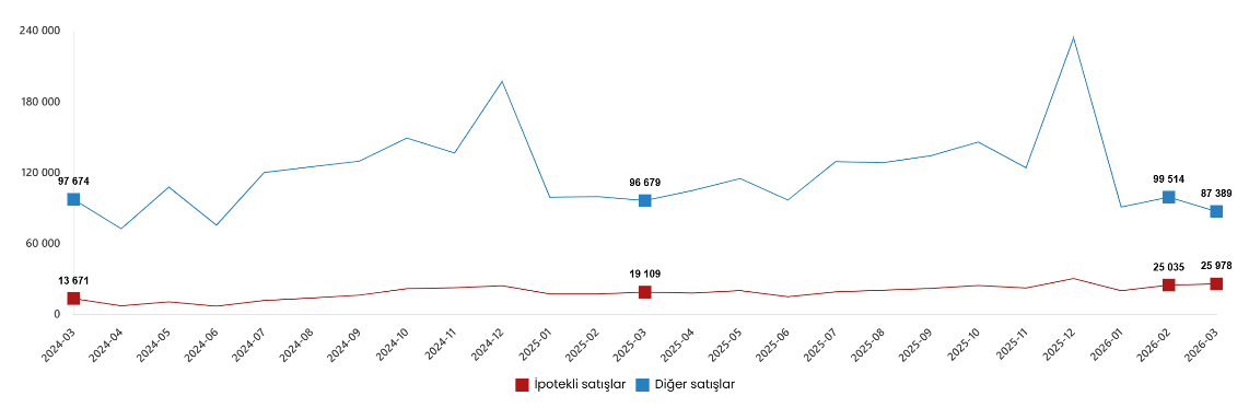 Türkiye genelinde ipotekli konut satışları Mart ayında bir önceki yılın aynı ayına göre %35,9 oranında artarak 25 bin 978 oldu. Diğer konut satışları ise Mart ayında bir önceki yılın aynı ayına göre %9,6 oranında azalarak 87 bin 389 oldu. Toplam konut satışları içinde ipotekli satışların payı %22,9 diğer satışların payı %77,1 olarak gerçekleşti.