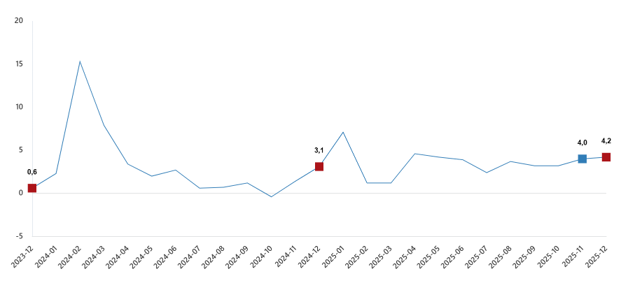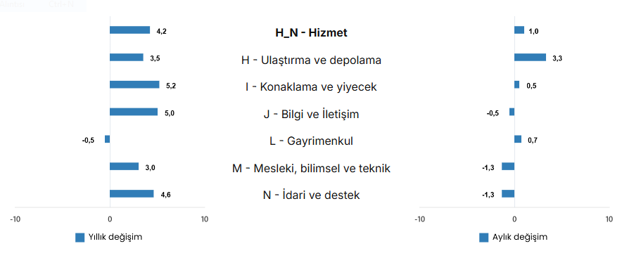 Hizmet üretim endeksi (2021=100) 2025 yılı Aralık ayında bir önceki yılın aynı ayına göre %4,2 arttı. Aynı ayda ulaştırma ve depolama hizmetleri %3,5 arttı, konaklama ve yiyecek hizmetleri %5,2 arttı, bilgi ve iletişim hizmetleri %5,0 arttı, gayrimenkul hizmetleri %0,5 azaldı, mesleki, bilimsel ve teknik hizmetler %3,0 arttı, idari ve destek hizmetleri ise %4,6 arttı.