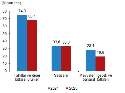 Üretim miktarları, 2025 yılında bir önceki yıla göre tarla ürünleri olan tahıllar ve diğer bitkisel ürünlerde (yem bitkileri hariç) %9,0, sebzelerde %0,9, meyveler, içecek ve baharat bitkilerinde %30,9 oranında azaldı. Buna göre, yaklaşık üretim miktarları tahıllar ve diğer bitkisel ürünlerde 68,1 milyon ton, sebzelerde 33,3 milyon ton, meyveler, içecek ve baharat bitkilerinde ise 19,6 milyon ton olarak gerçekleşti.