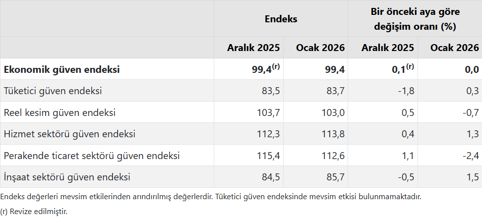 Ekonomik güven endeksi, Ocak 2026