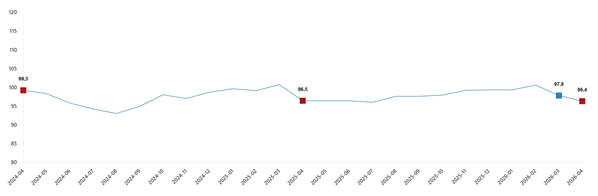 Ekonomik güven endeksi Mart ayında 97,9 iken, Nisan ayında %1,5 oranında azalarak 96,4 değerini aldı.