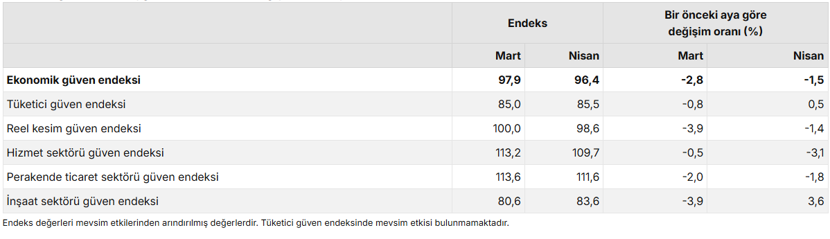 Bir önceki aya göre Nisan ayında tüketici güven endeksi %0,5 oranında artarak 85,5 değerini, reel kesim (imalat sanayi) güven endeksi %1,4 oranında azalarak 98,6 değerini, hizmet sektörü güven endeksi %3,1 oranında azalarak 109,7 değerini, perakende ticaret sektörü güven endeksi %1,8 oranında azalarak 111,6 değerini, inşaat sektörü güven endeksi %3,6 oranında artarak 83,6 değerini aldı.
