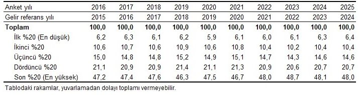 Son yapılan araştırma sonuçlarına göre; en yüksek eşdeğer hanehalkı kullanılabilir fert gelirine sahip %20'lik grubun toplam gelirden aldığı pay bir önceki yıla göre 0,1 puan azalarak %48,0 olurken en düşük gelire sahip %20'lik grubun aldığı pay ise 0,1 puan artarak %6,4 oldu.