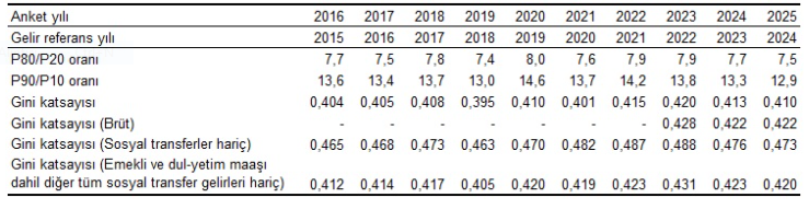 Daha önceki yıllardan farklı olarak 2025 yılı sonuçları ile birlikte, idari kayıtlardan elde edilen vergi ve sosyal güvenlik priminin net kullanılabilir gelire dahil edilmesi ile elde edilen brüt gelir için Gini katsayısı hesaplandı.