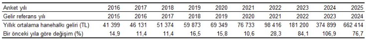 Yıllık ortalama hanehalkı kullanılabilir geliri ve bir önceki yıla göre değişim, 2016-2025