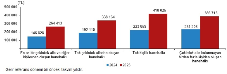 Yıllık ortalama eşdeğer hanehalkı kullanılabilir fert gelirlerinde en yüksek gelir, geçen yıla göre 194 bin 166 TL artarak 418 bin 025 TL ile tek kişilik hanehalklarının oldu. Çekirdek aile bulunmayan birden fazla kişiden oluşan hanehalklarının yıllık ortalama eşdeğer hanehalkı kullanılabilir fert geliri 386 bin 713 TL iken tek çekirdek aileden oluşan hanehalklarında bu değer 338 bin 164 TL oldu. En düşük yıllık ortalama eşdeğer kullanılabilir hanehalkı fert gelirine sahip hanehalkı tipi ise 264 bin 413 TL ile en az bir çekirdek aile ve diğer kişilerden oluşan hanehalkları oldu.