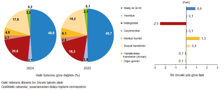 Toplam gelir içerisinde en yüksek payı, %49,7 ile bir önceki yıla göre 0,9 puan artan maaş ve ücret geliri aldı. İkinci sırayı %18,3 ile önceki yıla göre 2,5 puan azalan müteşebbis geliri alırken üçüncü sırayı %18,2 ile önceki yıla göre 0,4 puanlık artış gösteren sosyal transfer geliri oluşturdu.