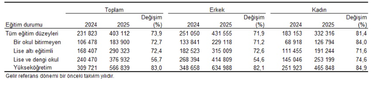 Eğitim durumuna göre yıllık ortalama esas iş gelirleri sırasıyla yükseköğretim mezunlarında 566 bin 839 TL, lise ve dengi okul mezunlarında 376 bin 932 TL, lise altı eğitimlilerde 290 bin 323 TL, bir okul bitirmeyenlerde 183 bin 900 TL olarak hesaplandı. Geçen yıla göre yıllık ortalama esas iş gelirinde en yüksek artış %83,0 ile yükseköğretim, en düşük artış ise %56,7 ile lise ve dengi okul mezunlarında oldu.