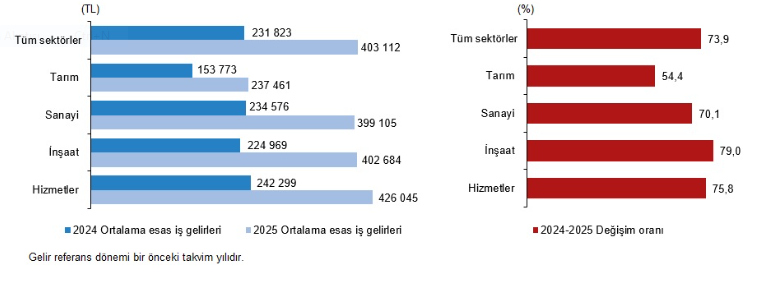 Esas iş gelirleri sektörel ayrımda incelendiğinde; en yüksek yıllık ortalama gelirin 426 bin 045 TL ile hizmet sektöründe, en düşük yıllık ortalama gelirin ise 237 bin 461 TL ile tarım sektöründe olduğu görüldü. Bir önceki yıla göre; yıllık ortalama esas iş gelirinde en yüksek artış %79,0 ile inşaat sektöründe gözlenirken, bunu %75,8 ile hizmet sektörü izledi. Diğer taraftan sanayi sektöründe %70,1, tarım sektöründe ise %54,4 artış gözlendi.