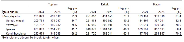 Esas işteki durumlarına göre yıllık ortalama esas iş gelirleri (TL), 2024, 2025