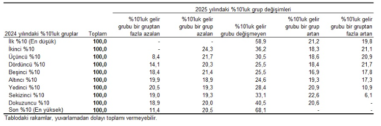 Eşdeğer hanehalkı kullanılabilir fert gelirine göre sıralı %10'luk gelir grupları itibarıyla fertlerin bir önceki yıla göre yüzdelik geçişleri incelendiğinde; bir önceki yılda ilk %10'luk grupta olan fertlerin 2025 yılında %58,9'unun, son %10'luk grupta olan fertlerin ise %68,1'inin gelir grubu değişmedi. Ayrıca 2024 yılında ilk %10'luk grupta olan fertlerin %19,8'i 2025 yılında bir gelir grubundan fazla yükseldi. Son %10'luk grupta olan fertlerin %11,4'ü ise bir gelir grubundan fazla düştü.