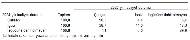Gelir ve Yaşam Koşulları Araştırması panel veriden elde edilen sonuçlara göre 2024 yılında işsiz olan fertlerin %38,7'si 2025 yılında çalışmaya başladı. Faaliyet durumu 2024 yılında çalışan olarak belirlenen fertlerin %90,3'ü 2025 yılında çalışma hayatına devam etti. Bir önceki yıl işgücüne dahil olmayan fertlerin ise %10,1'i işgücüne (çalışan+işsiz) katıldı.