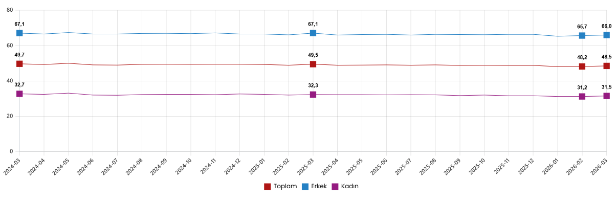 İstihdam edilenlerin sayısı 2026 yılı Mart ayında bir önceki aya göre 226 bin kişi artarak 32 milyon 425 bin kişi, istihdam oranı ise 0,3 puan artarak %48,5 oldu. Bu oran erkeklerde %66,0 iken kadınlarda %31,5 olarak gerçekleşti.