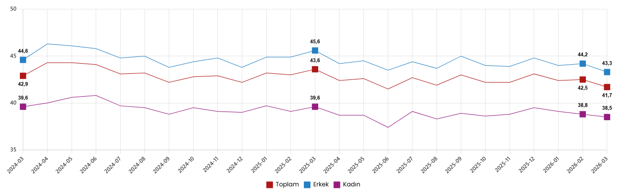 İstihdam edilenlerden referans döneminde işbaşında olanların, mevsim ve takvim etkilerinden arındırılmış haftalık ortalama fiili çalışma süresi 2026 yılı Mart ayında bir önceki aya göre 0,8 saat azalarak 41,7 saat olarak gerçekleşti.