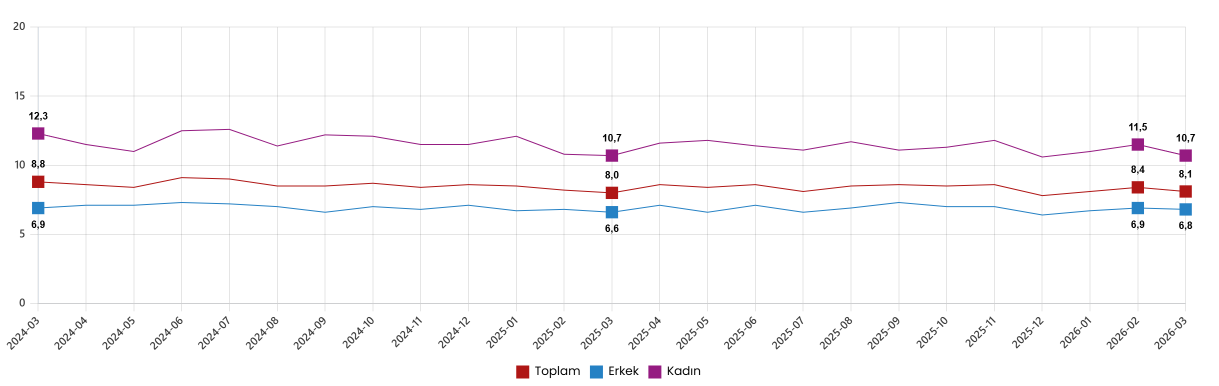 Hanehalkı İşgücü Araştırması sonuçlarına göre; 15 ve daha yukarı yaştaki kişilerde işsiz sayısı 2026 yılı Mart ayında bir önceki aya göre 96 bin kişi azalarak 2 milyon 873 bin kişi oldu. İşsizlik oranı ise 0,3 puan azalarak %8,1 seviyesinde gerçekleşti. İşsizlik oranı erkeklerde %6,8 iken kadınlarda %10,7 olarak tahmin edildi.