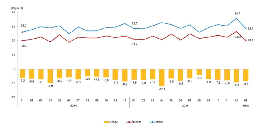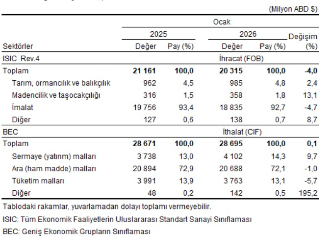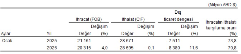Türkiye İstatistik Kurumu ile Ticaret Bakanlığı iş birliğiyle genel ticaret sistemi kapsamında üretilen geçici dış ticaret verilerine göre; ihracat 2026 yılı Ocak ayında, bir önceki yılın aynı ayına göre %4,0 azalarak 20 milyar 315 milyon dolar, ithalat %0,1 artarak 28 milyar 695 milyon dolar olarak gerçekleşti.