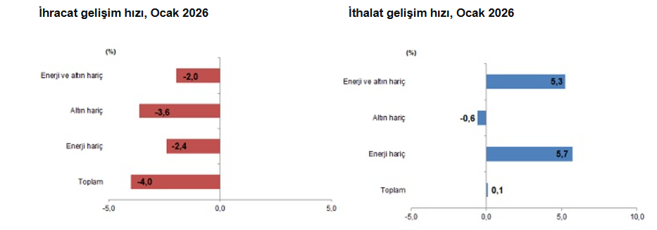 Mevsim ve takvim etkilerinden arındırılmış seriye göre; 2026 Ocak ayında bir önceki aya göre ihracat %5,8, ithalat %3,7 azaldı. Takvim etkilerinden arındırılmış seriye göre ise; 2026 yılı Ocak ayında bir önceki yılın aynı ayına göre ihracat %1,5 azalırken, ithalat %3,4 arttı.