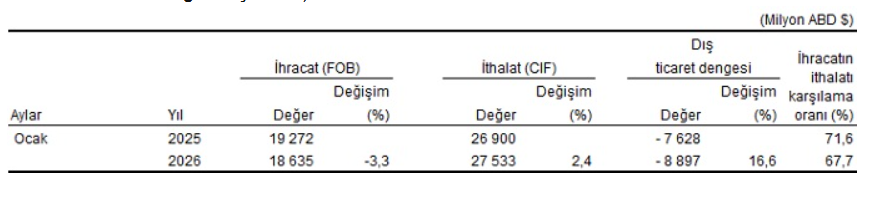 Ocak ayında dış ticaret açığı %16,6 artarak 7 milyar 628 milyon dolardan, 8 milyar 897 milyon dolara yükseldi. İhracatın ithalatı karşılama oranı 2025 Ocak ayında %71,6 iken, 2026 Ocak ayında %67,7'ye geriledi.
