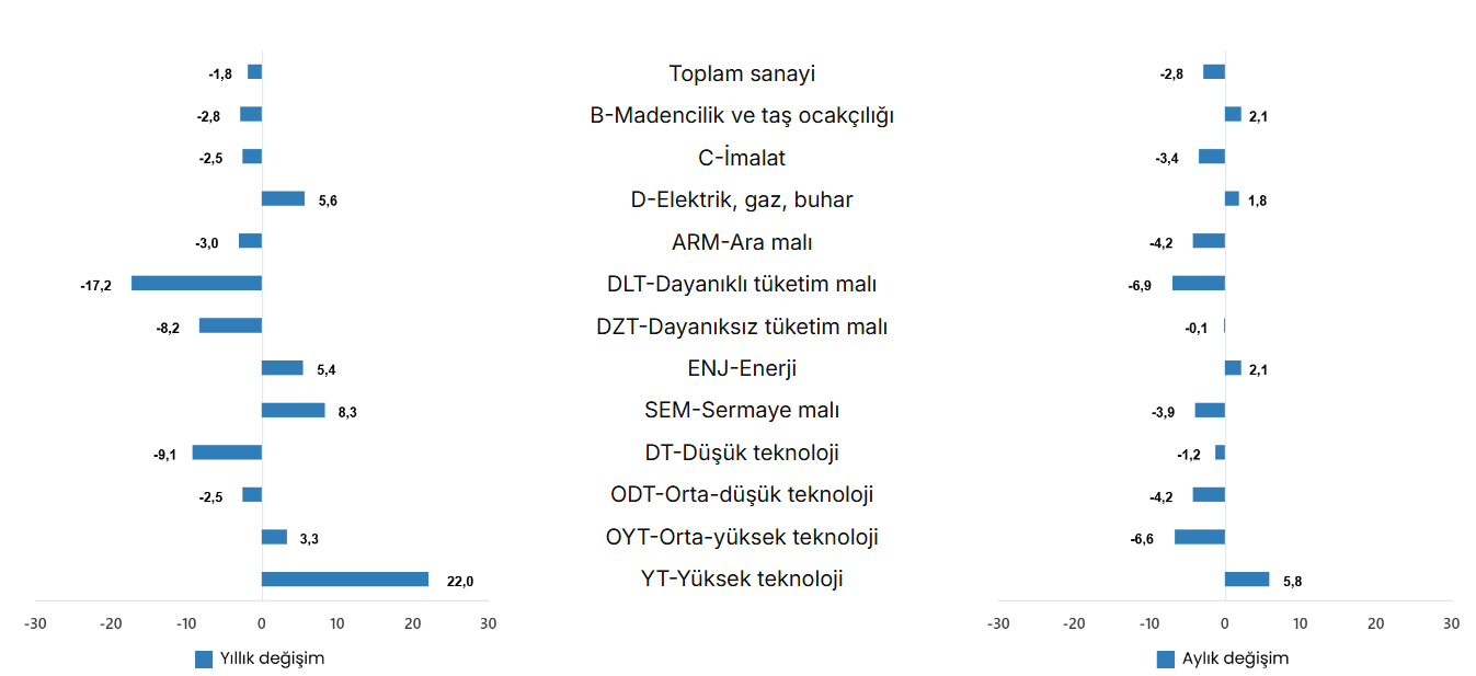 Sanayinin alt sektörleri (2021=100 referans yıllı) incelendiğinde, 2026 yılı Ocak ayında madencilik ve taş ocakçılığı sektörü endeksi bir önceki yılın aynı ayına göre %2,8 azaldı, imalat sanayi sektörü endeksi %2,5 azaldı ve elektrik, gaz, buhar ve iklimlendirme üretimi ve dağıtımı sektörü endeksi %5,6 arttı.