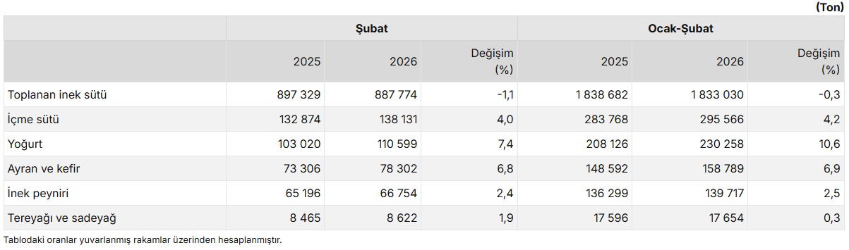 Şubat ayında bir önceki yılın aynı ayına göre, inek peyniri üretimi %2,4 arttı, ayran ve kefir üretimi %6,8 arttı, yoğurt üretimi %7,4 arttı, içme sütü üretimi %4,0 arttı, tereyağı ve sadeyağ üretimi %1,9 arttı. Ocak-Şubat döneminde ise bir önceki yılın aynı dönemine göre, inek peyniri üretimi %2,5 arttı, ayran ve kefir üretimi %6,9 arttı, yoğurt üretimi %10,6 arttı, içme sütü üretimi %4,2 arttı, tereyağı ve sadeyağ üretimi %0,3 arttı.
